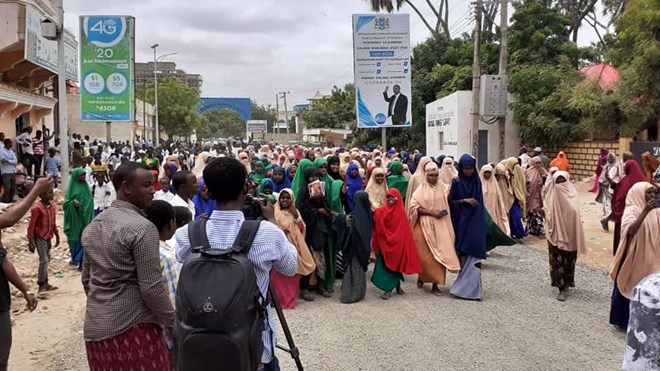 Demonstrators at the protest, said to have been organized by opposition presidential hopefuls, were shouting "Coup, no; election, yes" referring to the claim that Mohamed Abdullahi Mohamed, the current president, is trying to mount a coup against Mohamed Hussein Roble, the prime minister.