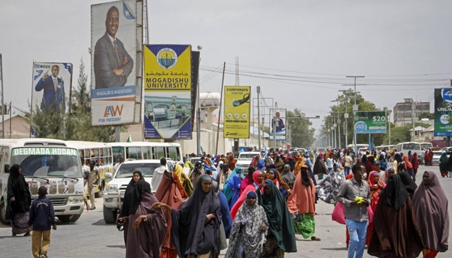 Somalis walk past billboards showing candidates Abdirahman Abdishakur Warsame and Omar Abdulkadir Ahmedfiqi in Mogadishu, Somalia Friday, Jan. 29, 2021. (AP Photo/Farah Abdi Warsameh)
