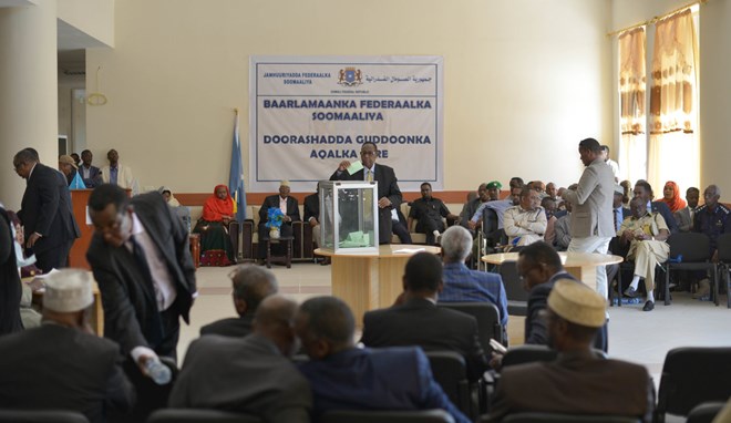 Senators belonging to the Upper House cast their votes to determine the Speaker of the Upper House, as well as the two Deputy Speakers, during an election in Mogadishu, Somalia, on 22 January 2017. UN Photo