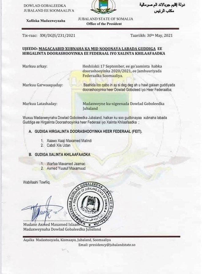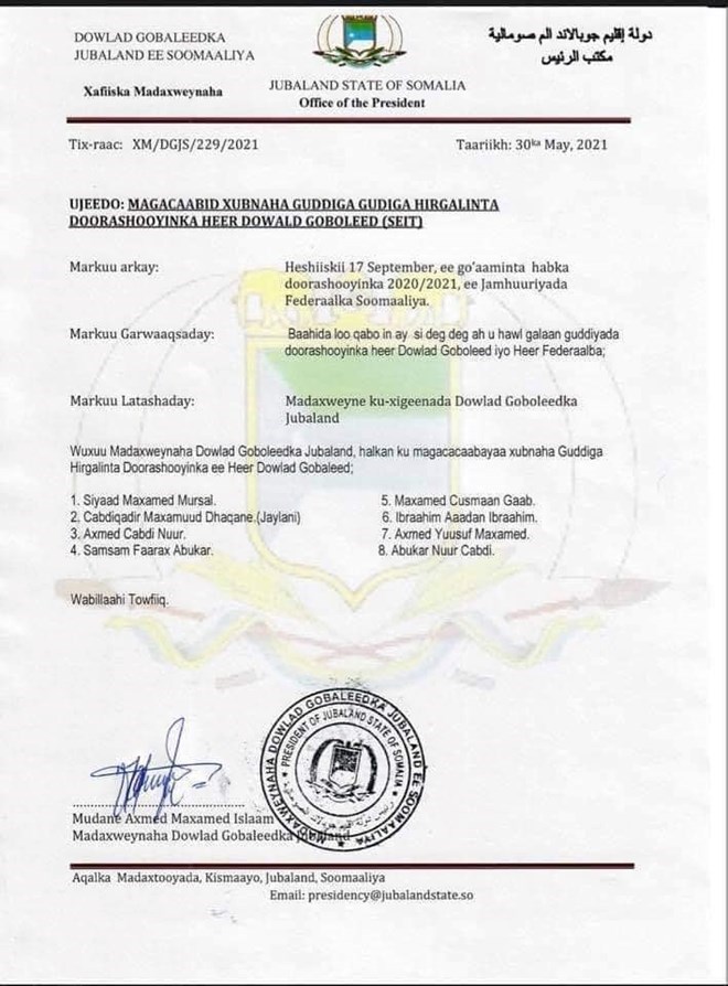 Mogadishu (HOL) The President of the Jubbaland State has appointed members to the Federal and State Electoral Commissions.