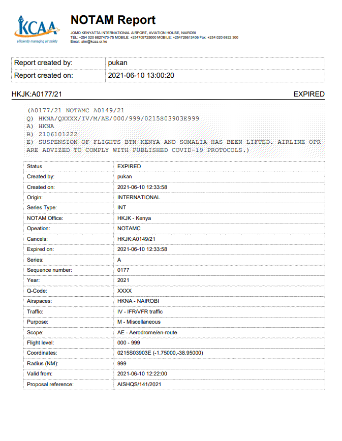 The Kenyan Civil Aviation Authority have announced the lifting of a previous suspension on flights between Kenya and Somalia in NOTAM Report issued today.