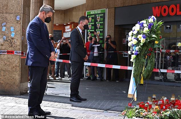 Flowers were piled up Sunday outside the nearby store where the attack started. Bavaria's governor, Markus Soeder, laid a wreath and described the attack as "simply incomprehensible, appalling, senseless."