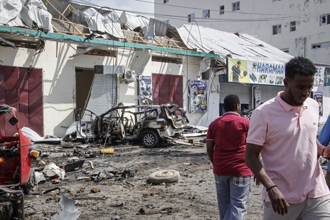 People walk past wreckage at the scene of a bombing in Mogadishu, Somalia, Saturday, Feb. 13, 2021. (AP Photo/Farah Abdi Warsameh)