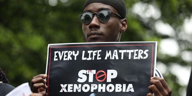 A demonstrator holds a sign during a protest against xenophobia outside of the main gate of the South African High Commission which was shut down to avert reprisal attacks in Abuja, on September 5, 2019. - South Africa said on September 5, 2019 it had temporarily closed its diplomatic missions in Nigeria following violence against South African businesses carried out in reprisal for attacks on foreign-owned stores in Johannesburg. Photo by KOLA SULAIMON/AFP via Getty Images.