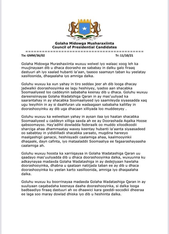Mogadishu (HOL) - The Council of Presidential Candidates (CPC) said that it was deeply concerned about the delay in Somalia's federal elections and its ramifications.