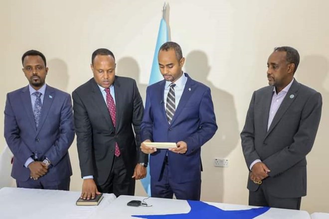 MOGADISHU (HOL) - Prime Minister Mohamed Roble officiated the swearing-in of new Security Minister Abdullahi Mohamed Nur Thursday afternoon following his appointment Wednesday night, even as President Mohamed Farmaajo cried foul over the move.