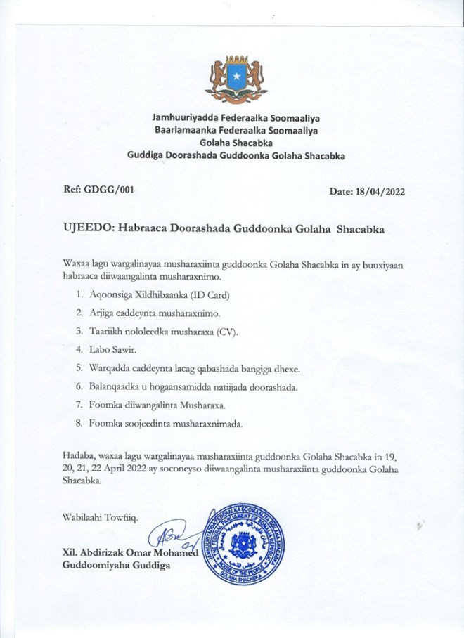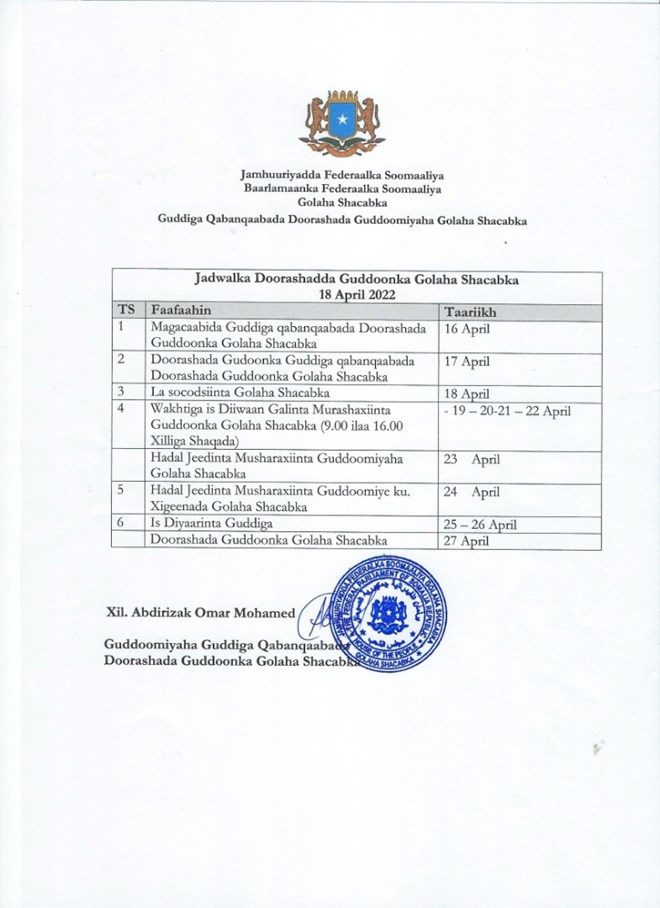 Mogadishu (HOL) - The two houses of the Somali parliament held a joint meeting in Mogadishu on Monday and approved the timetable for the election of the house speakers.