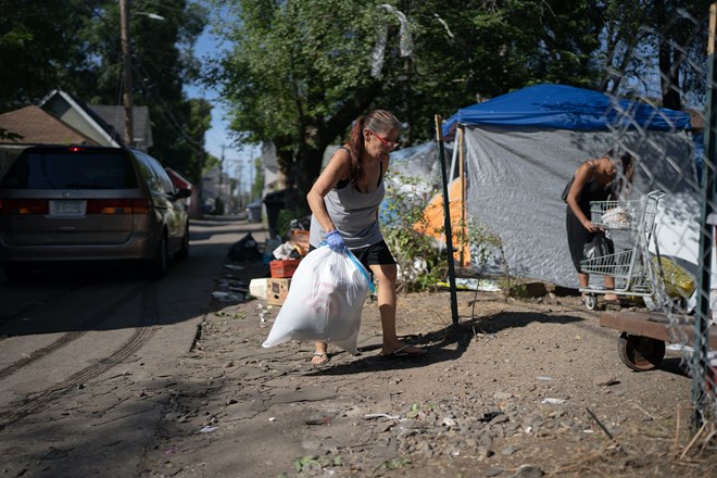 Janessa Banks has lived in a tent at 29th and Bloomington going on three weeks. She keeps to herself, carrying everything she owns in two bags slung over each arm when she goes on walks through the alleys. At age 31, she has been homeless since 18, she said, addiction thwarting her ability to maintain stable housing and custody of her two sons.