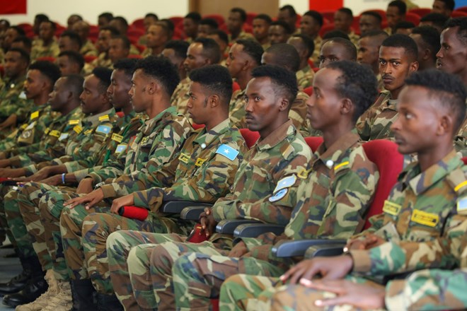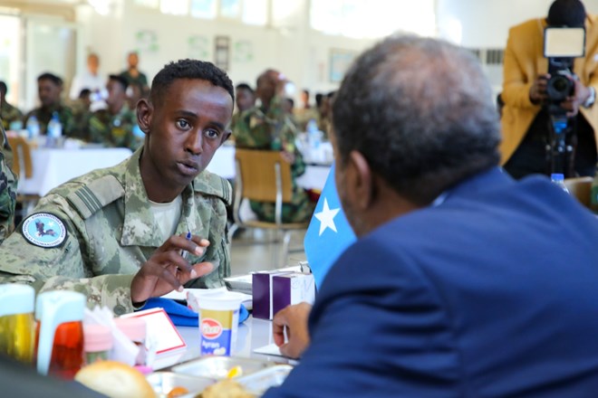 Teachers and administrators at the center briefed the President on the progress of the Somali Special Forces. President Mohamud told the soldiers about the government's plans to rebuild the army and maintain security in the country and commended them for their willingness to give their lives to defend their country and their people.
