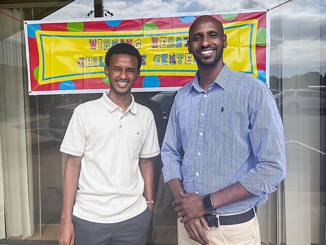 Business Manager Anis Abdullahi (left) and owner Mohamed Ahmed stand in front of a sign for Winning Heart Child Care Center in Mankato. The center opened Wednesday, aiming to serve multicultural families in the area. Photos by Olivia Stevens