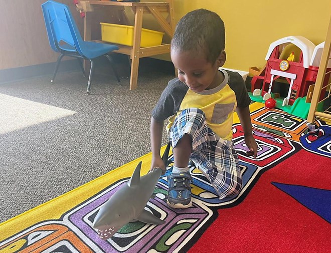 Ismail Adbi, son of Winning Heart owner Mohamed Ahmed, plays with a toy shark in the Pre-K room of the day care center during an open house Tuesday. Olivia Stevens