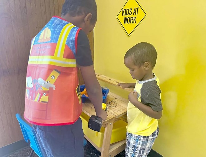 Winning Heart Owner Mohamed Ahmed’s sons, Omar (left) and Ismail Abdi, play with a toy construction kit in the Pre-K room of the child care center. Olivia Stevens