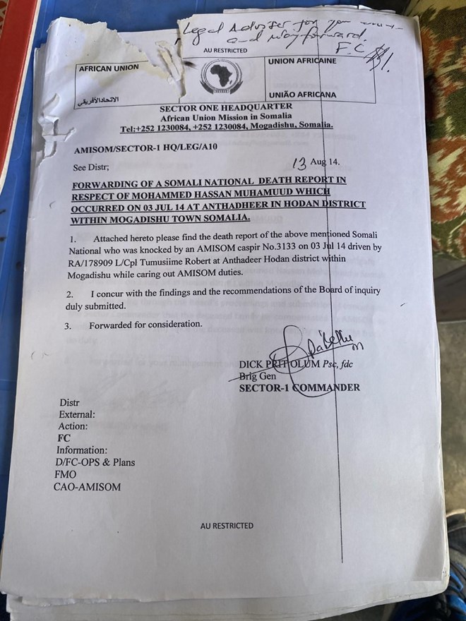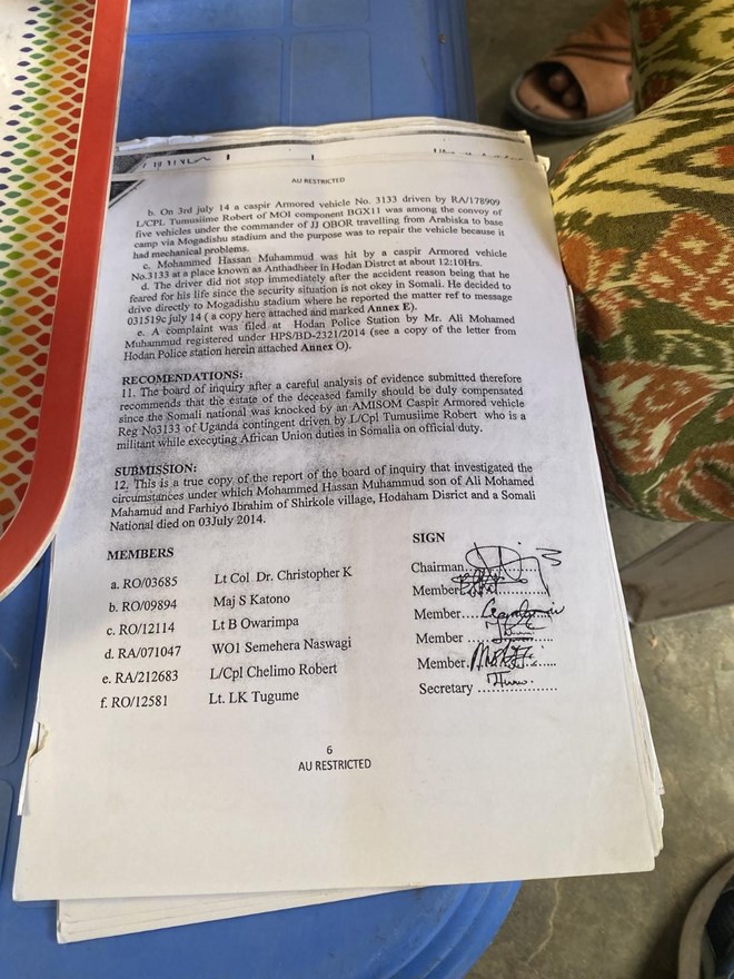 The findings, as detailed in the documents, concluded that the AMISOM convoy was at fault in the death of Mohamed and therefore the family should be duly compensated.