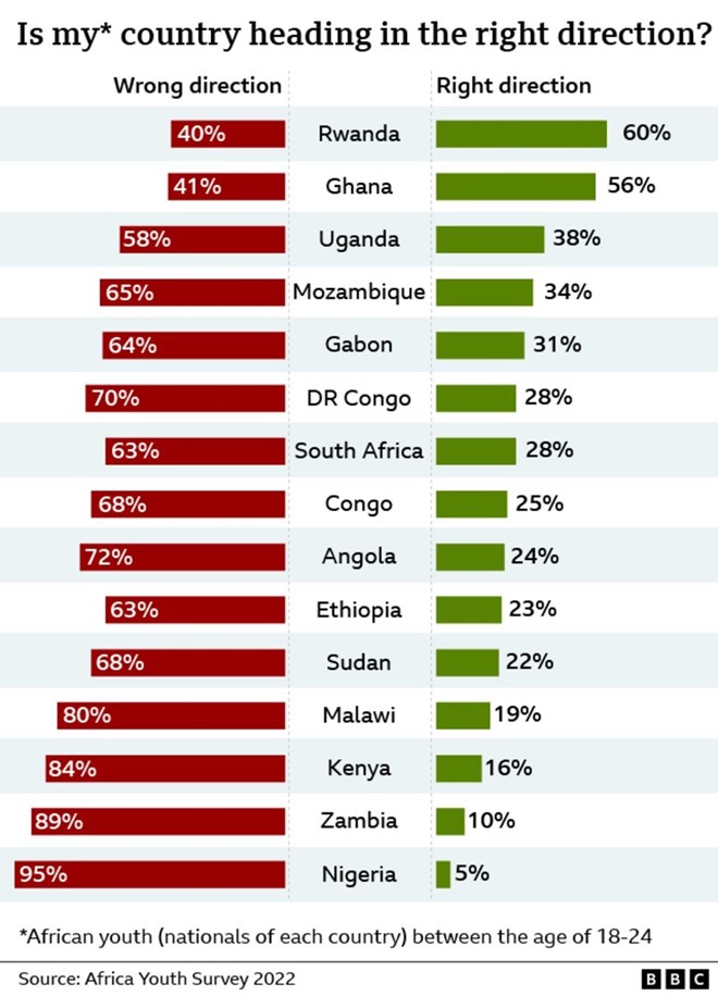 The statistics from the African Youth Survey 2022, carried out in 15 countries by the South African Ichikowitz Family Foundation, back up Mr Oni's pessimism.