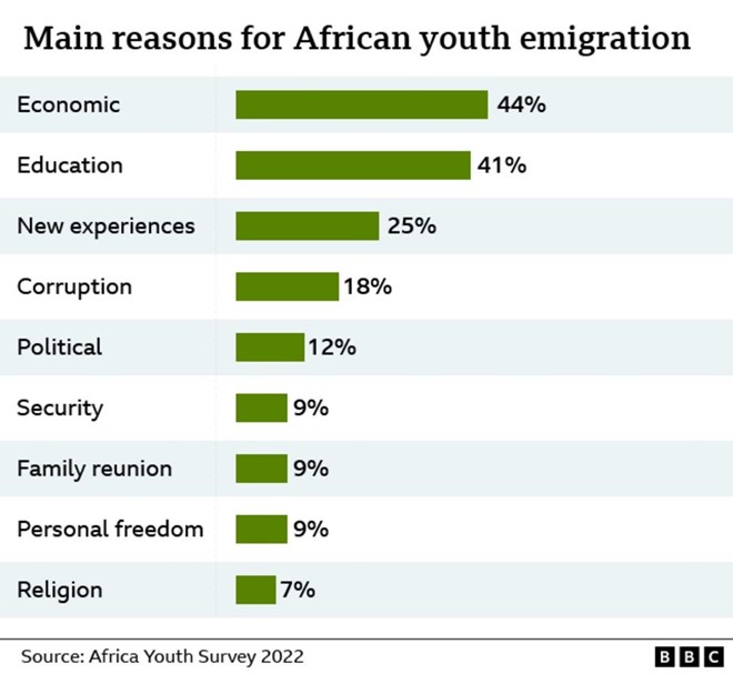 "It's bigger than a brain drain," Mr Ichikowitz told the BBC Newsday programme. "This group of people, 18 to 24 year olds in Africa, are saying: 'We are going to improve our lives, even if it means having to up and leave and go somewhere else.'"
