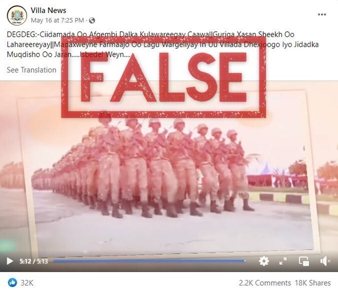 A video viewed more than 500,000 times on Facebook claims that just one day after Somalia’s presidential election, troops staged a coup and destroyed the newly-elected president’s residence. This is false: there have been no reports of a coup in Somalia, and AFP reporters on the ground confirmed that the claim is baseless. The video, which features footage of soldiers marching, includes scenes from a military parade that took place prior to the election.