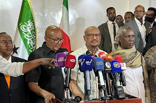 Waddani Party leader Abdirahman Mohamed Abdullahi (L) and UCID Party Leader Faysal Ali Warabe (R) during a press conference on Sunday. The two opposition leaders announced they would no longer recognize the legitimacy of the Somaliland government after its constitutional mandate expired on November 13, 2022. SUPPLIED