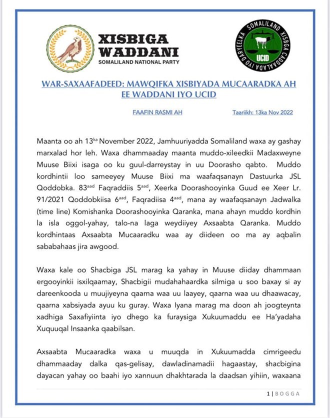 It goes on to say that the opposition parties only recognize Musa Bihi as the 'Chairman of Kulmiye Party' and refer to him as the 'President whose term expired.'