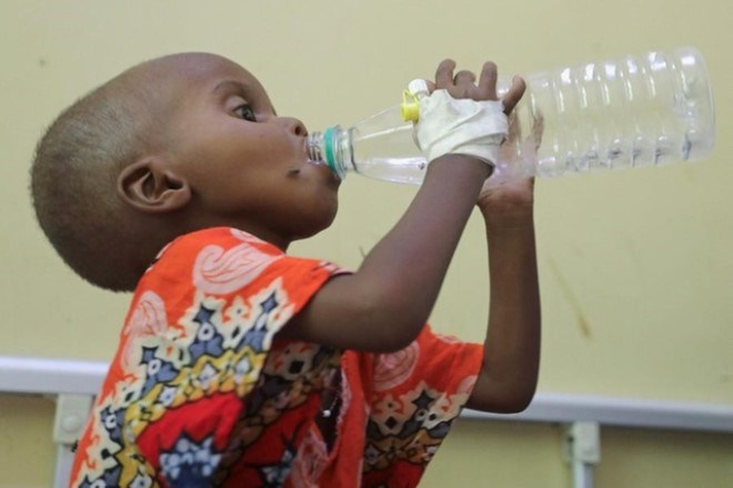 Jamila Omar, 3, a malnourished Somali child displaced by the worsening drought due to failed rain seasons, drinks water from a bottle at the paediatric ward in the Banadir Hospital, in Mogadishu, Somalia September 24, 2022. REUTERS/Feisal Omar