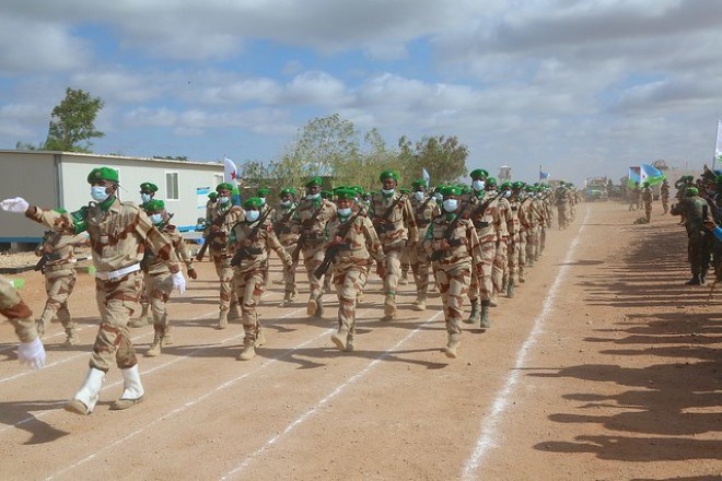 Djibouti troops detached to ATMIS on parade. ATMIS