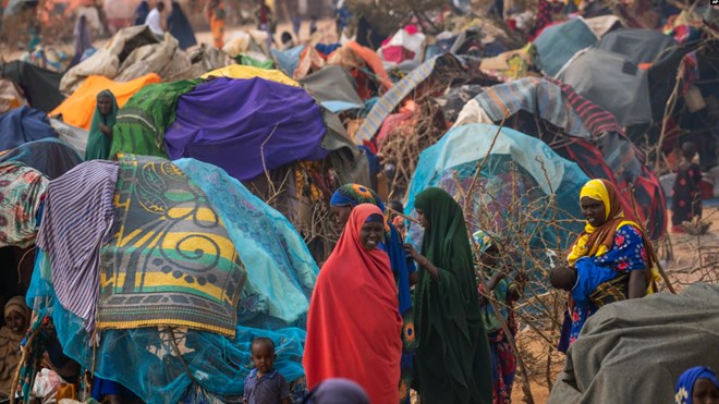 People walk through a displacement camp outskirts of Dollow, Somalia, Sept. 19, 2022. Somalia is in the midst of the worst drought anyone there can remember.