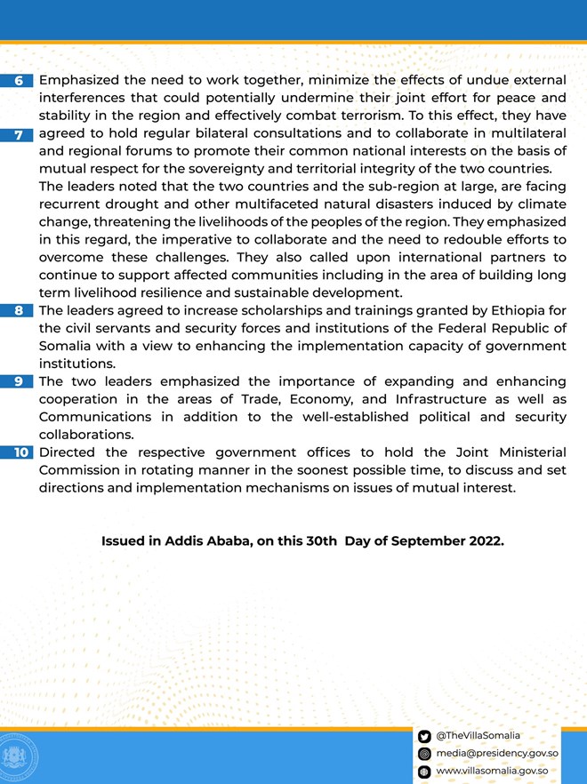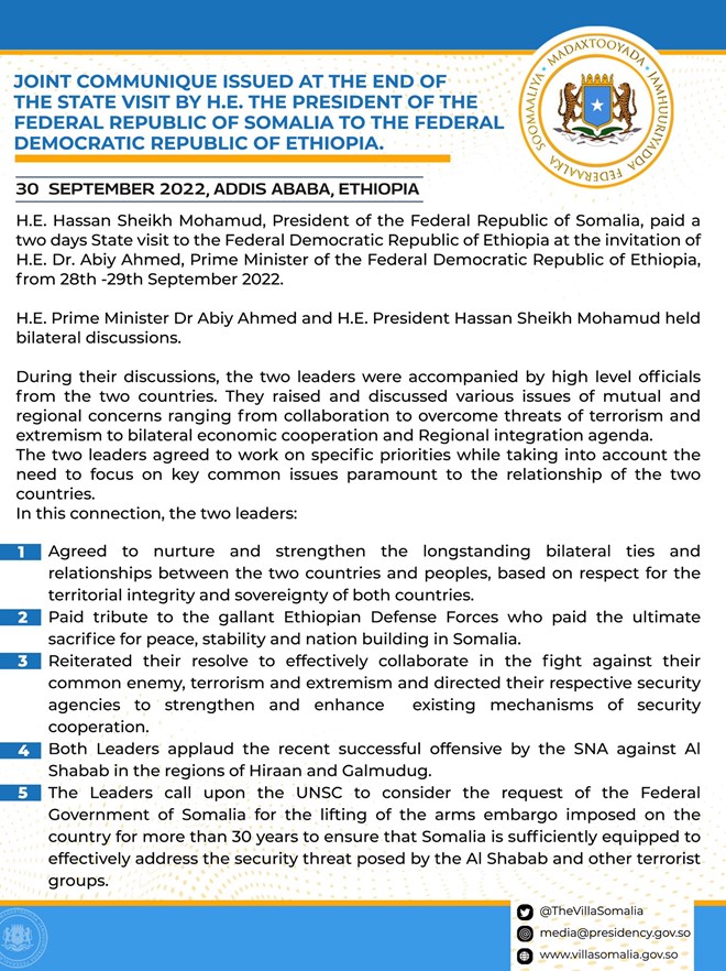 The statement was part of a ten-point joint communique issued on Friday following Somalia's President Hassan Sheikh Mohamud's two-day state visit to Addis Ababa.