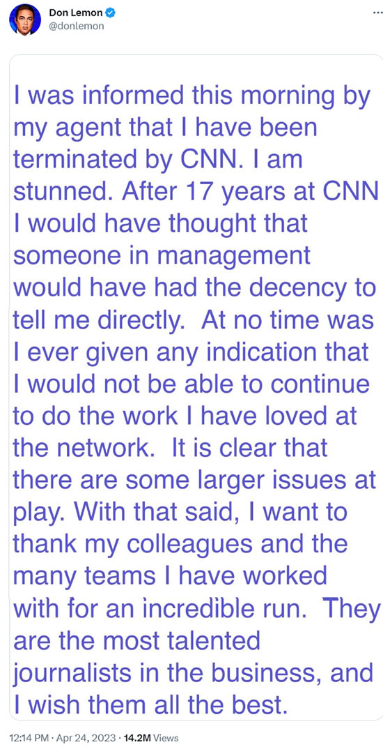 "I am stunned," Lemon wrote. "After 17 years at CNN I would have thought someone in management would have had the decency to tell me directly."
