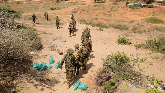 FILE - Kenya Defence Forces (KDF) soldiers, who are part of the African Mission in Somalia (AMISOM), march to their armoured vehicles before an area patrol on the outskirts of the controlled area of the old airport in the coastal town of Kismayu in southern Somalia Nov. 12, 2013. (Reuters)