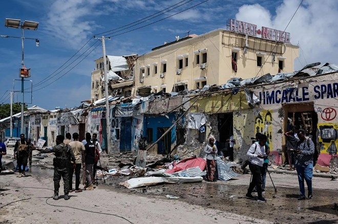 Members of the media report in front of building destroyed after a deadly siege by al-Shabab jihadists at Hayat Hotel in Mogadishu on Aug. 21, 2022. HASSAN ALI ELMI/AFP VIA GETTY IMAGES