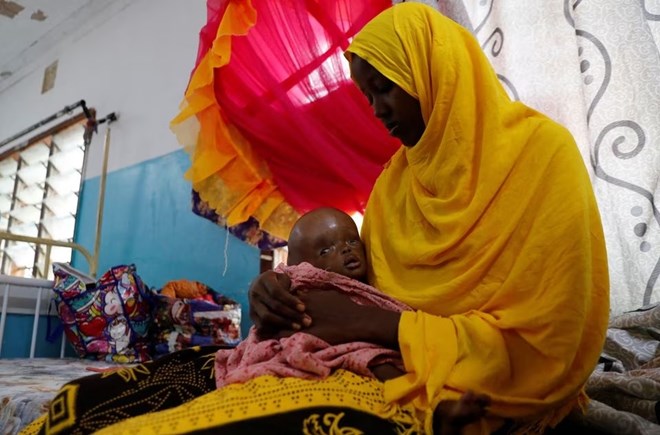 Dool Abdirahman Ismael, 26, a Somali refugee, carries her child Hikimo Mohamed as he receives treatment for malnutrition inside the International Rescue Committee (IRC) stabilization ward at the Hagadera Main Hospital in the Hagadera refugee camp in Dadaab, near the Kenya-Somalia border, in Garissa County, Kenya, January 16, 2023. REUTERS/Thomas Mukoya