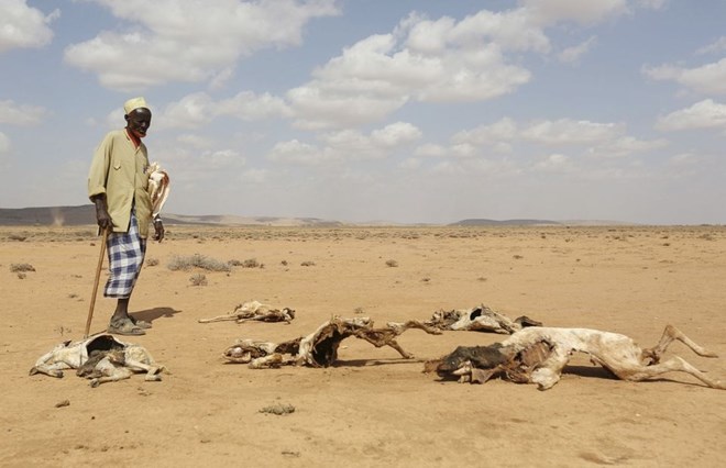 A man looks at the carcasses of animals that died due to the El Nino-related drought in Marodijeex town of southern Hargeysa, in northern Somalia's semi-autonomous Somaliland region, April 7, 2016. Picture taken April 7, 2016. REUTERS/Feisal Omar