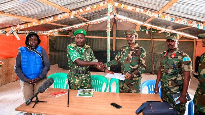 Atmis Burundi National Defence Forces Commander of the Forward Operating Base (FOB) Lt Col Richard Binyenimana (L) shakes hands with Somalia National Army Commander Maj Gen Bashir Abukar Ahmed during the handing over Xaaji Cali FOB in Hirshabelle State in Somalia on June 20, 2023. PHOTO | ATMIS