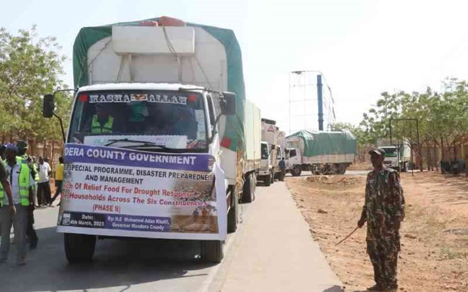 Trucks of relief food were flagged off by Mandera governor Mohamed Kalif. [Ibrahim Adan Ali, Standard]
