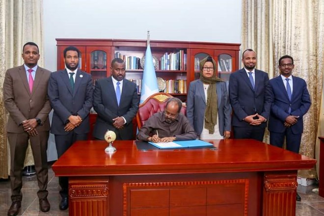 Mogadishu (HOL) - Somali President Hassan Sheikh Mohamud signed three bills into law on Wednesday night: the Financial Sanctions Law, the National Intelligence and Security Agency Law, and the National Electricity Law. The signing ceremony was held at Villa Somalia, where President Mohamud expressed gratitude to lawmakers for ensuring that the laws meet the needs and circumstances of the country.