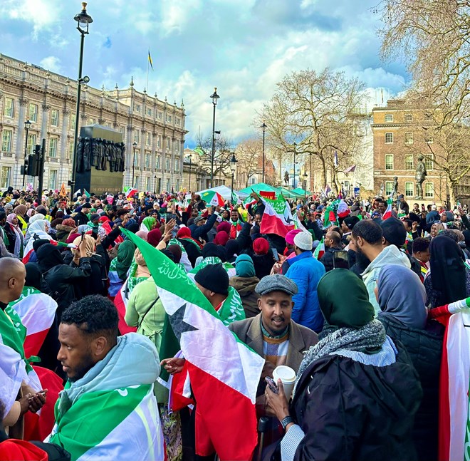 London (HOL) - The Somaliland Community in the UK held demonstrations outside the UK PM's Office on Downing Street on Saturday to show solidarit with their troops who are fighting in the disputed town of Las Anod. After six weeks of fighting, over 200 people have died, and hundreds more have been seriously injured.