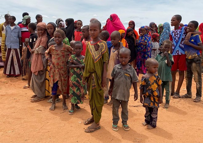 Internally displaced Somali children gather outside their makeshift shelters at the Ladan camp for internally displaced people (IDP) in Dollow, Somalia May 1, 2023. REUTERS/Ayenat Mersie