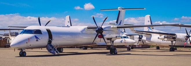 According to the ch-aviation fleets advanced module, Bluebird Aviation operates a fleet of ten (mostly leased) aircraft, including four DHC-8-100s, one DHC-8-Q400, three DHC-8-Q400(PF) freighters, and two F50s.