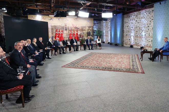 President Recep Tayyip Erdoğan speaks on a joint live broadcast in Istanbul, Türkiye, Friday, May 12, 2023. (AA Photo)