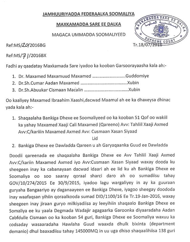 Ugu horreyntii waxaa loo baahan yahay in la fahmo Ha’yadda Qaranka ee la yiraahdo BANKIGA DHEXE EE SOOMAALIA “CENTTAL BANK OF SOMALIA). Hay’addaan waxaa lagu dhisay Sharcia Lr. 27 taarrikhdu markay ahay Nofeembar 26, 1968, waxayna ka madax bannaan tahay Hay’adaha Dawladda oo idil, maxaa yeelay waa Khasnajiga Qaranka Soomaaliyeed, waxayna u xil saaran tahay inay ilaaliso Qiimaha Lacagta Qaranka ee Shilin Soomaaliga iyo Sicir Bararka. Sannad kasta markii la xisaab xiro Bankiga wuxuu Qaranka siiyaa 50% ee faaiidadiisa, inta kalena oo ah 50% wuxuu ku biiriyaa Lacagta Kaydka (RESERVE ACCOUNT EE BANKIGA DHEXE EE SOOMAALIYA), si loogu daafaco qiimaha Shilin Soomaaliya iyo haddii khasaare uu Bankigu galo inuu ku....