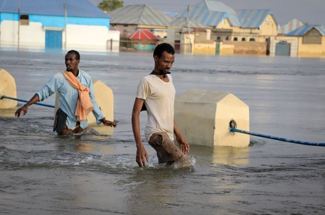 Men walk through floodwaters on a street in the town of Beledweyne, in Somalia Monday, May 15, 2023. Estimates from the UN Office for the Coordination of Humanitarian Affairs are that 460,000 people have been affected by flooding caused by heavy rains since mid-March. (AP Photo)