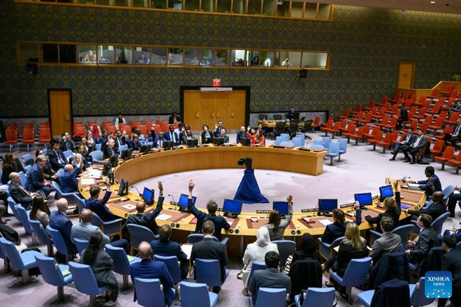 Representatives vote on a draft resolution during a UN Security Council meeting at the UN headquarters in New York, on Oct. 31, 2023. The UN Security Council on Tuesday adopted a resolution to renew the mandate of the UN Assistance Mission in Somalia (UNSOM) for a year, till Oct. 31, 2024. (Loey Felipe/UN Photo/Handout via Xinhua)