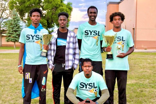 In front is coach and organizer Mohamed. In back, left to right, are coach Abdinasir, coach Mubashir, head of league Abdulaziz Abdullah, and coach Abdiwasa. (Chris Reineke/southernminn.com)