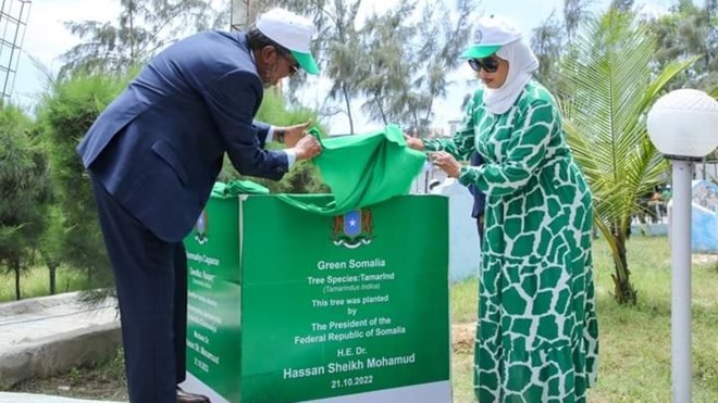 President Hassan Sheikh Mohamud with Environment and Climate Change Minister Khadija Almakhzoumi launch a project to re-establish tree cover in Mogadishu, Somalia in October 2022. PHOTO | VILLA SOMALIA