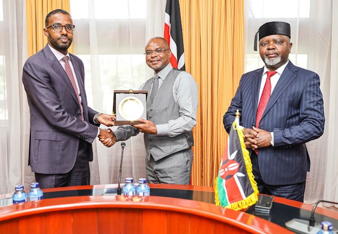 Senate Speaker Amason Jeffah Kingi (centre), flanked by his Deputy, Hon Kathuri Murungi (right), and Hon Ali Chacban Ibrahim, the Deputy Speaker of the Senate of the Federal Parliament of Somalia, during a courtesy call yesterday afternoon by a delegation from the Senate of the Federal Parliament of Somalia. The Somali team, which is on a benchmarking tour of the Parliament of Kenya, is drawn from various House committees and Senate management.