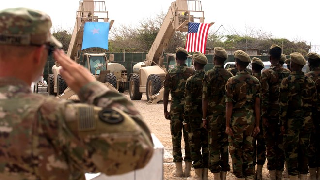 Somali national army soldiers stand in formation during a logistics course graduation ceremony. Soldiers from Somali's advanced infantry DANAB battalion spent 14 weeks training with the U.S. 10th Mountain division on the importance of logistical operation as well as the operation and maintenance of heavy equipment. (Photo by MC2 (SW/AW) Evan Parker. Released)