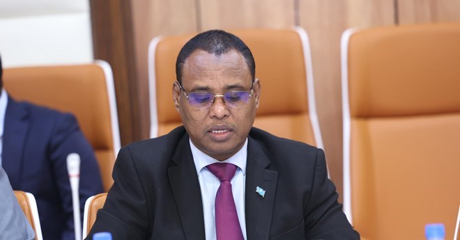 Somalia's Minister of Commerce and Industry, Jibril Abdirashid Haji, addresses key issues during a government meeting in Mogadishu, emphasizing the enforcement of directives aimed at safeguarding the nation's territorial integrity. CREDIT / SONNA