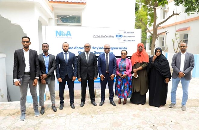 Somalia National Communication Authority Director General Mustafa Sheekh fifth from right with members of the East Africa Communications Organisation at the NCA offices in Mogadishu. Image: NCA