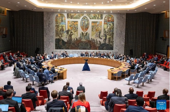 FILE - Representatives vote on a draft resolution during a Security Council meeting at UN headquarters in New York, on Dec. 1, 2023. (Eskinder Debebe/UN Photo/Handout via Xinhua)