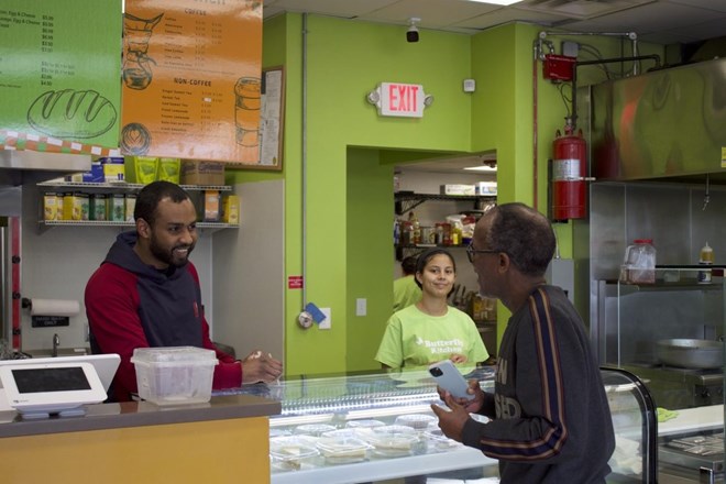 Workers greet Abdillahi Abdirahman, owner of Butterfly Falafel, in Roxbury. Butterfly Falafel is Somali-owned and was opened with the support of Somali Development Center.