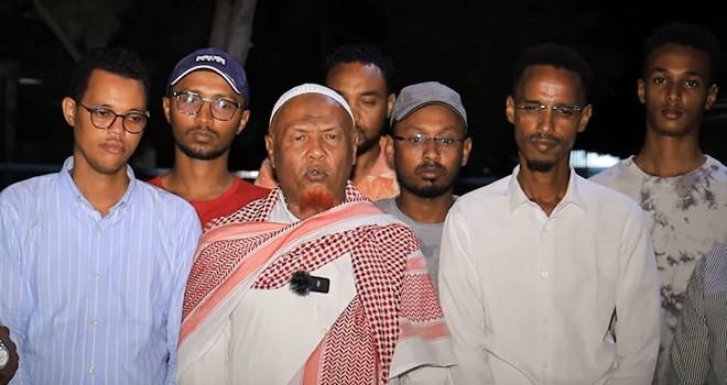 Sheikh Abdiaziz Mohamed, alongside his family, calls for justice during a press conference in Mogadishu, Somalia, on Tuesday, February 5, 2024, following the tragic murder of his pregnant daughter by her husband.